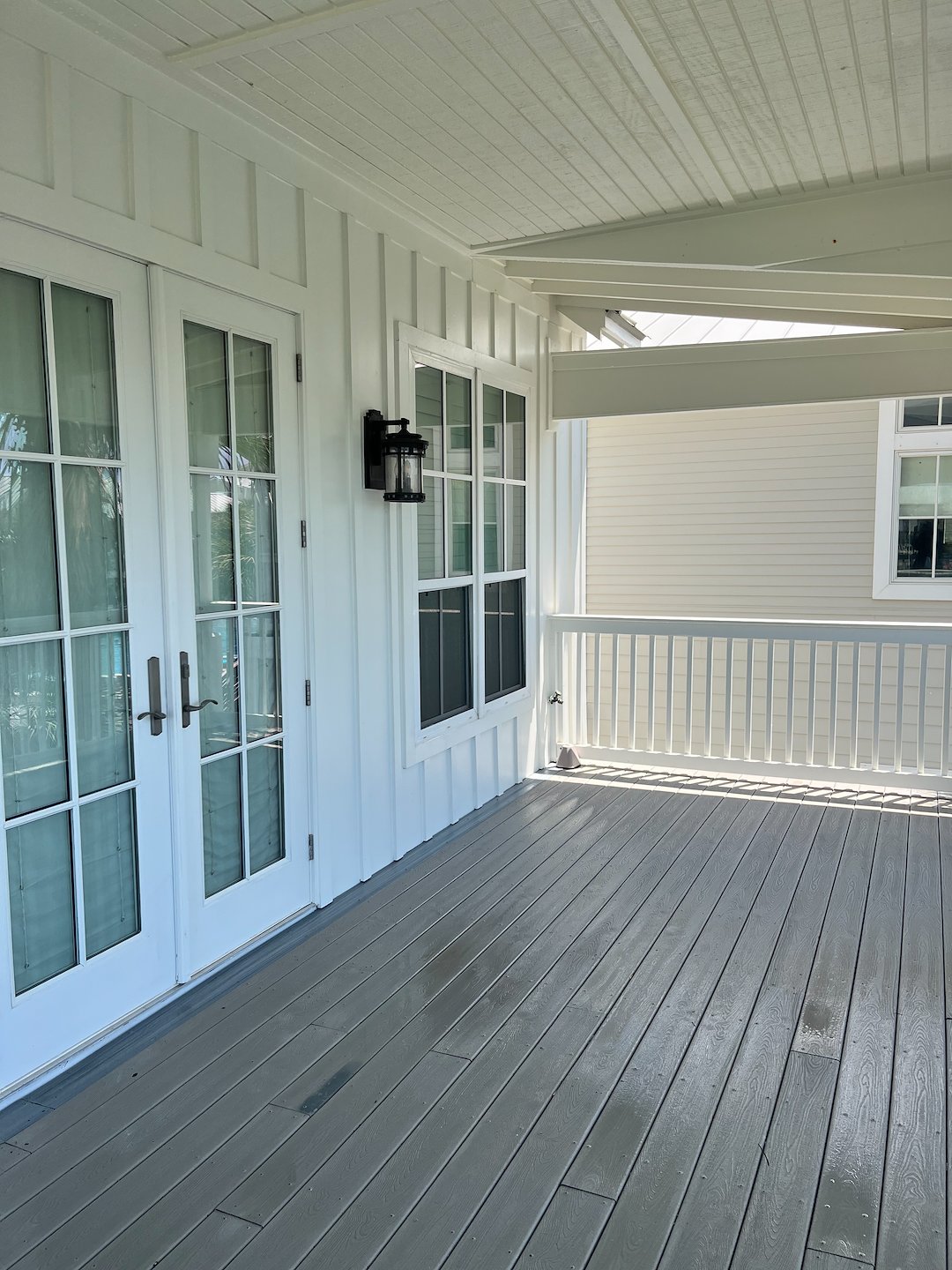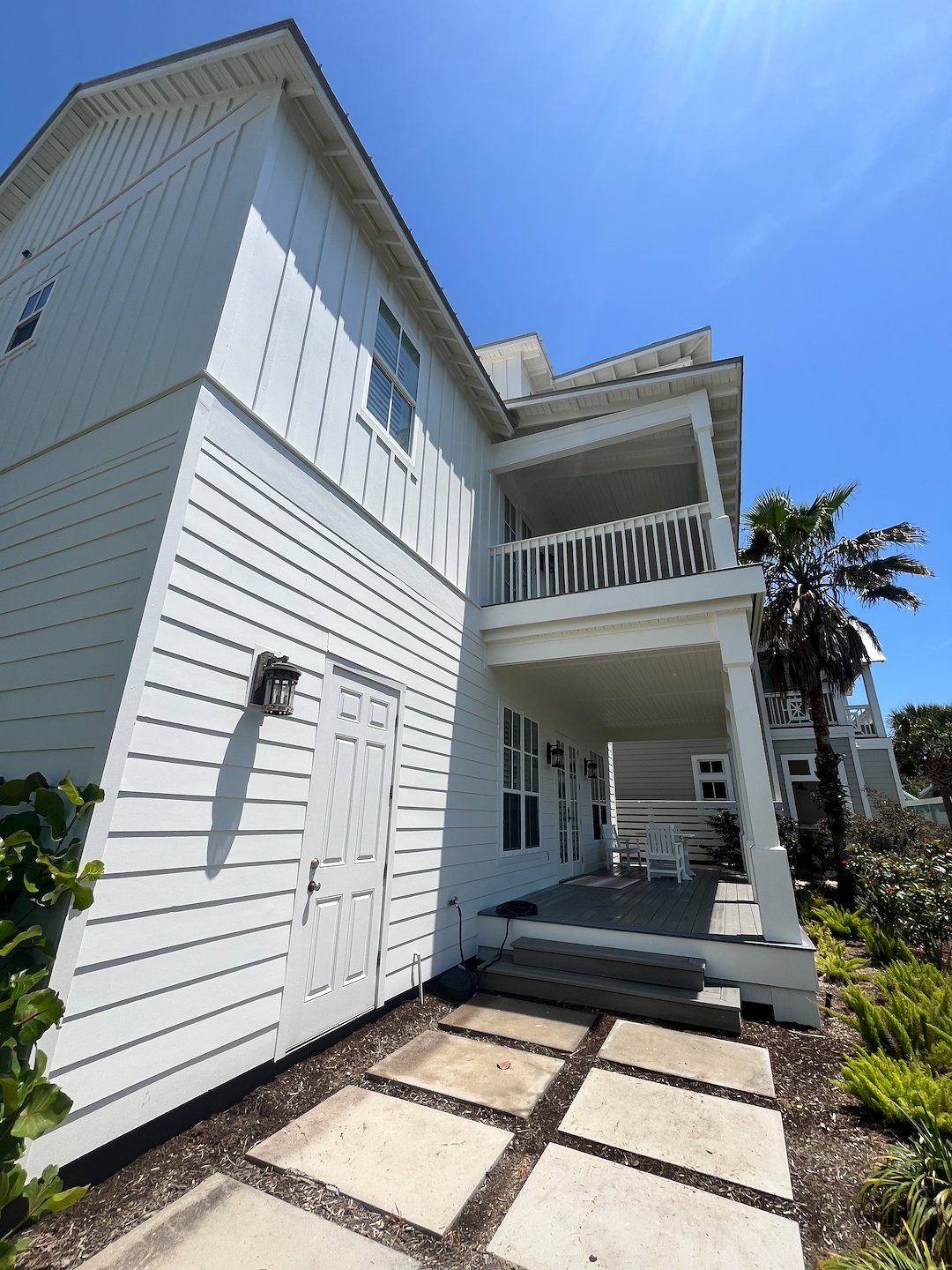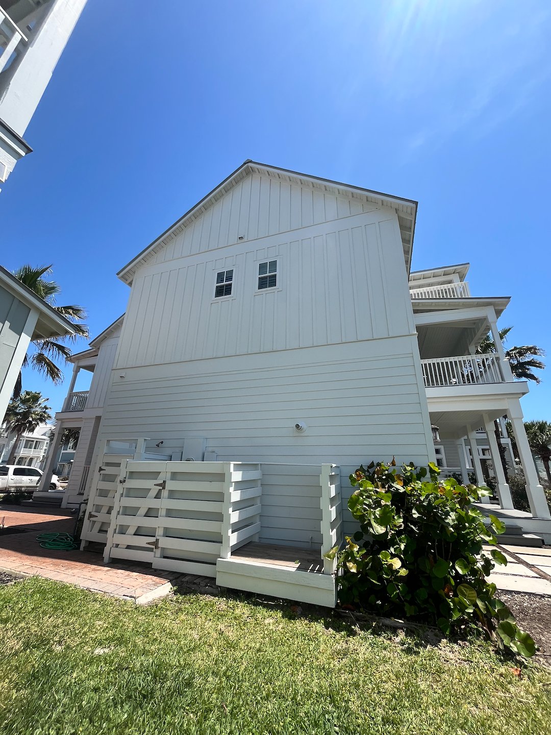 Mystic Pressure Wash LLC recently completed a professional house washing service at a beautiful property in the Cinnamon Shores community of Port Aransas, Texas. Homes in coastal neighborhoods like this are constantly exposed to wind-driven sand, salt in the air, humidity, and shade, which can lead to a buildup of dirt, organic growth, and debris. This particular home was showing visible signs of wear, including light algae growth, insect nests tucked along trim and soffits, and general surface discoloration from windblown contaminants. The homeowner reached out to us to restore the property’s clean and polished appearance without the risk of damage from high pressure. Because this home featured painted siding and decorative exterior elements, we chose our soft washing method to safely remove unwanted buildup while preserving the structure’s finish.
